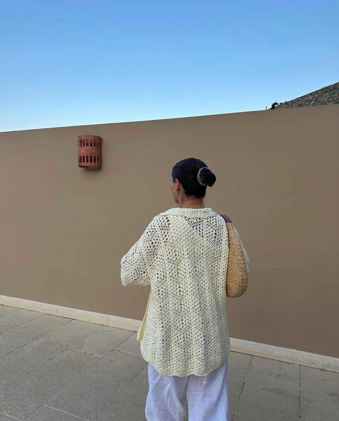 Liberta under the Greek evening sun with a gray midi, crochet cardigan & linen pants