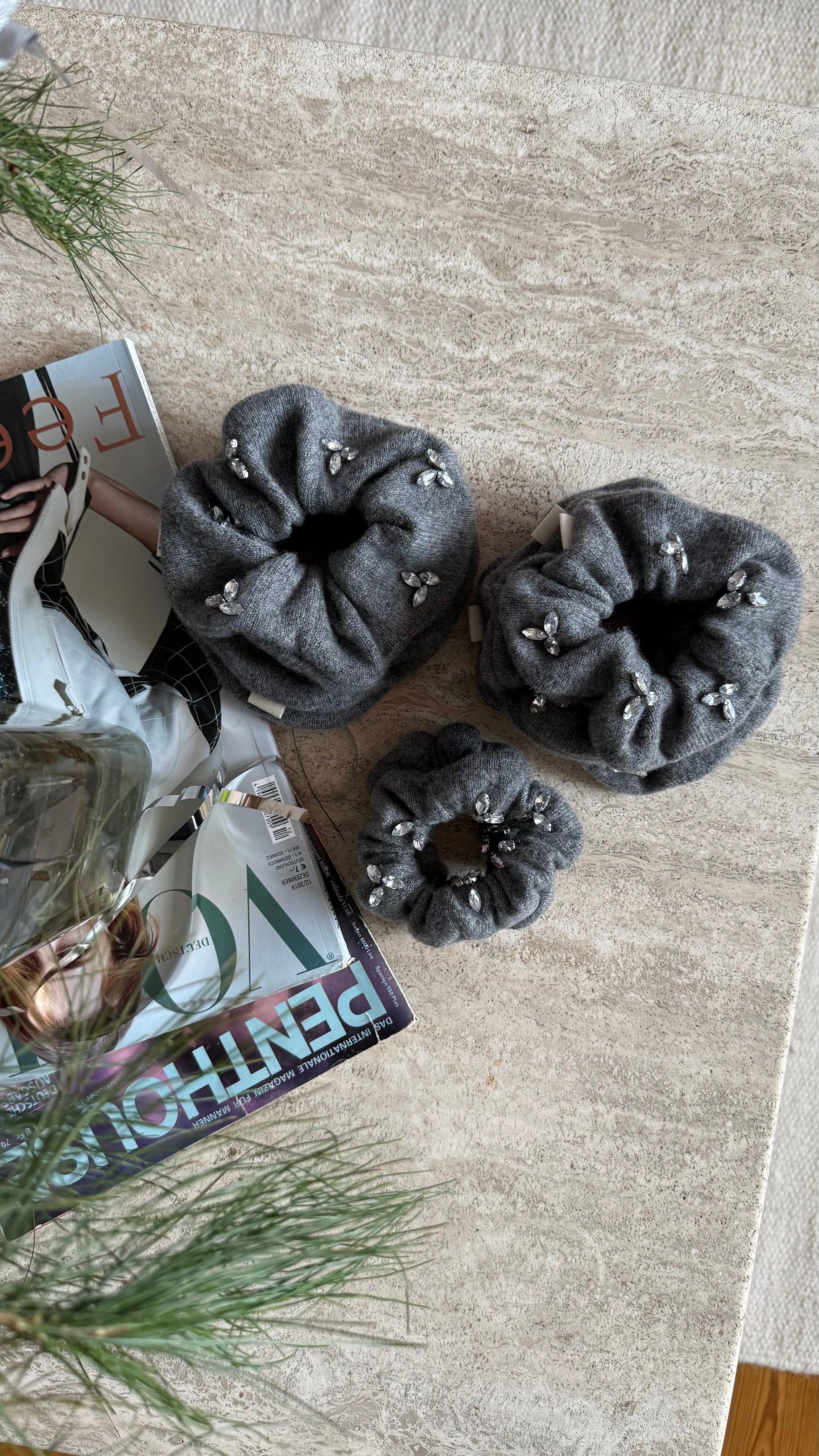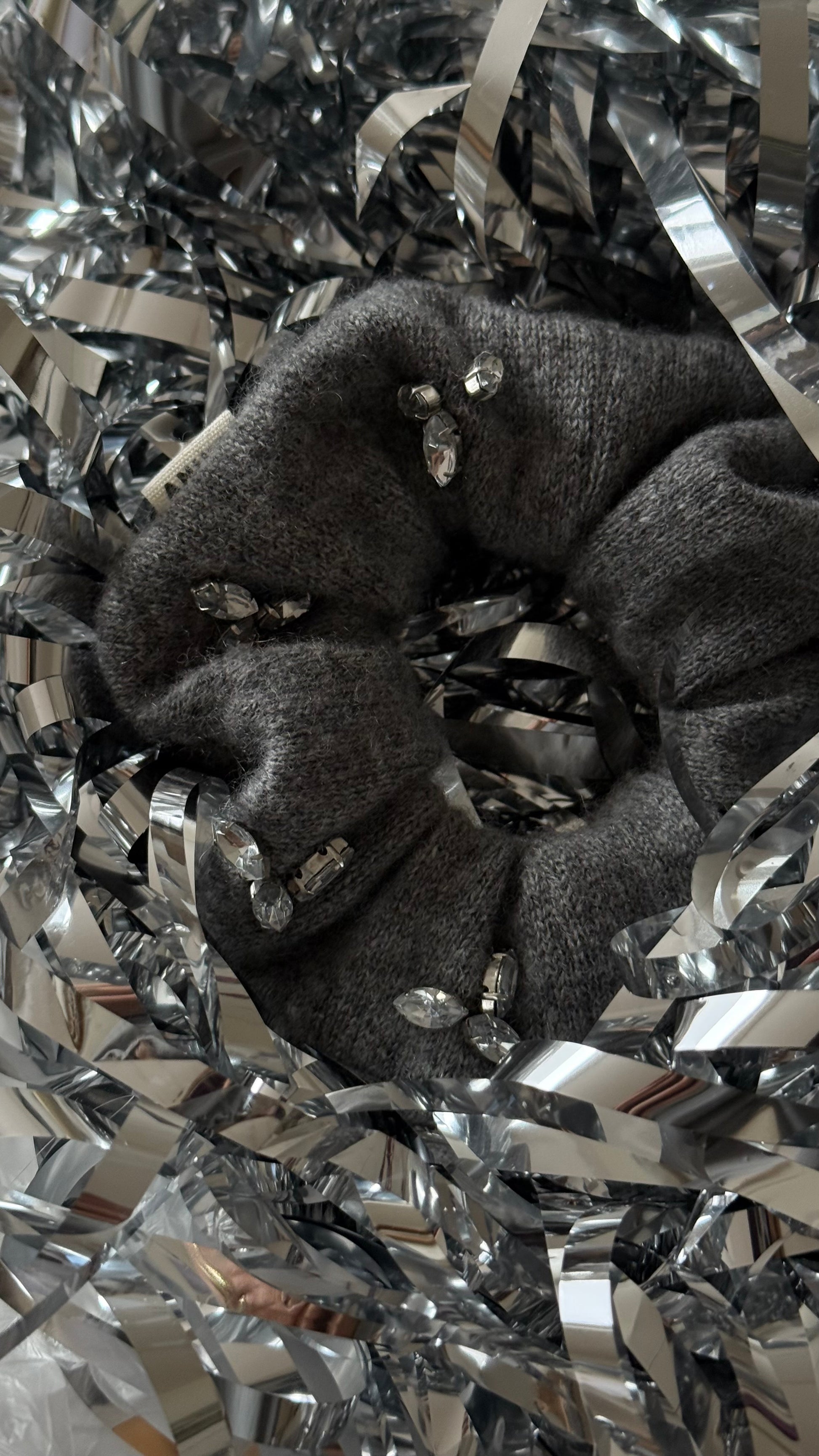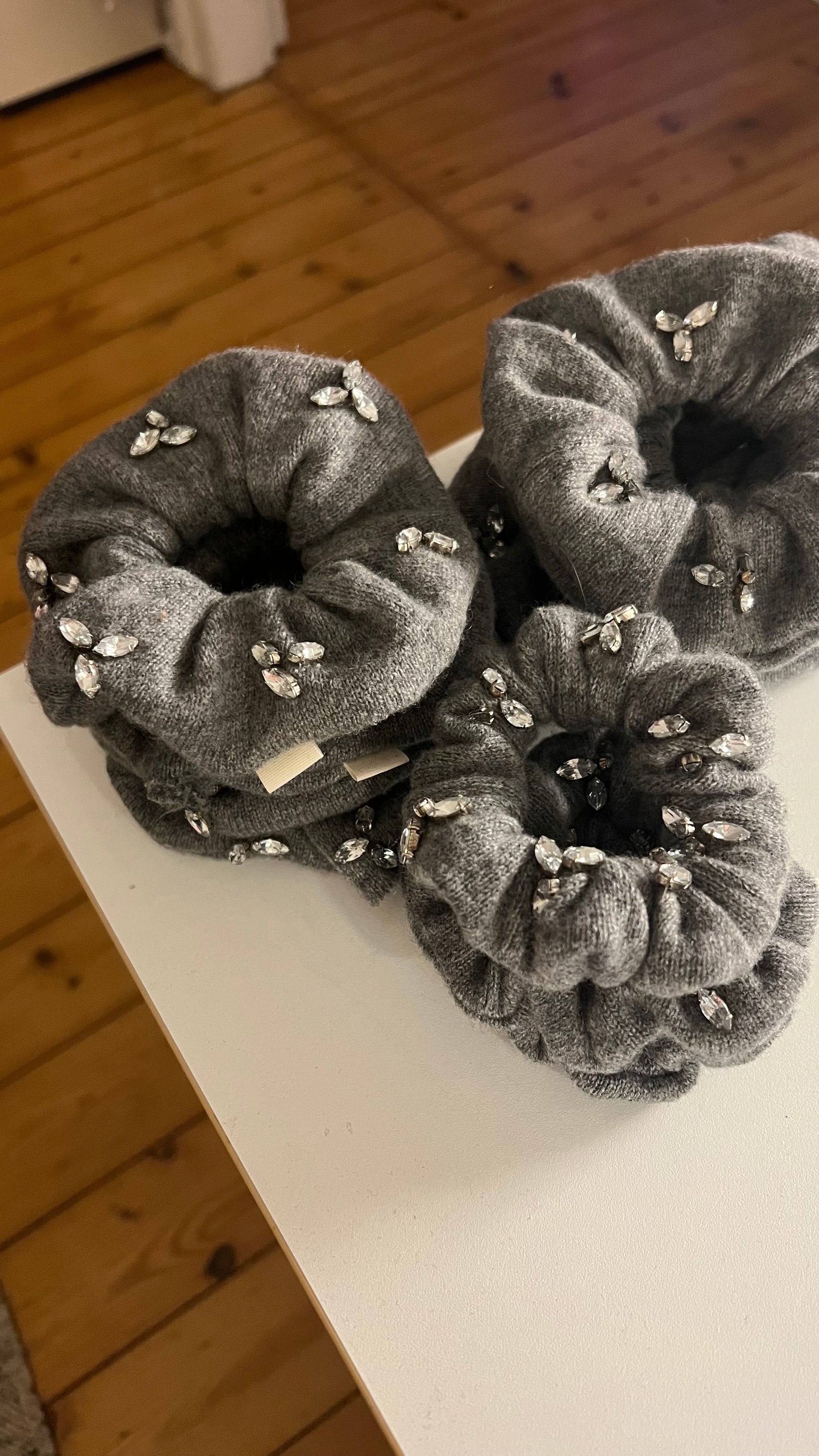 Dunkelgraues Kaschmir mit aufgesetzten Glitzersteinen. Diese Scrunchies stammen aus einem Kaschmir Pullover von der Marke Not Shy mit kleinen Löchern aber vor allem diesen hübschen funkelnden Glitzersteinen. Jeder Stein ist einzeln aufgenäht und gibt den Kaschmir Scrunchies diesen außergewöhnlichen Glam.