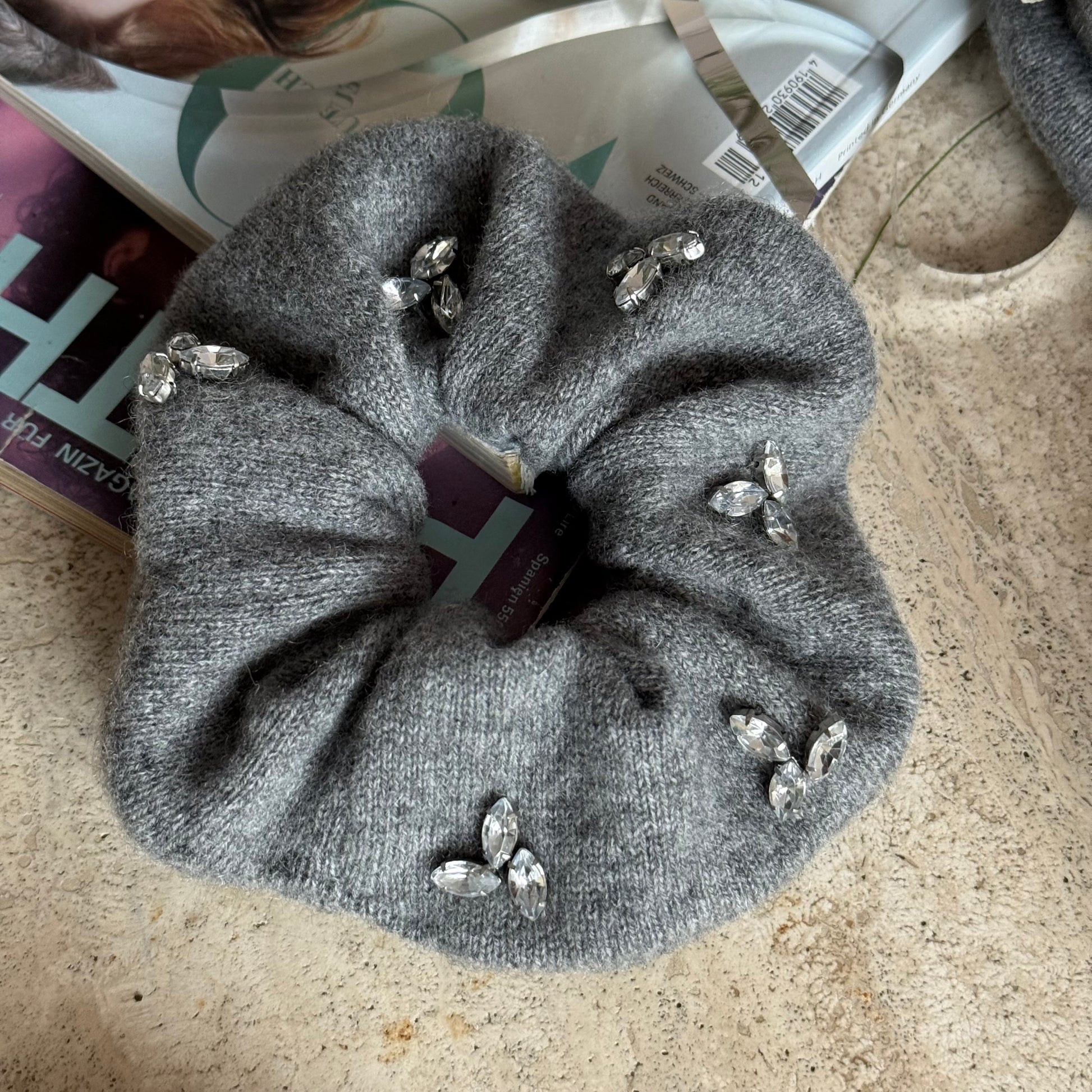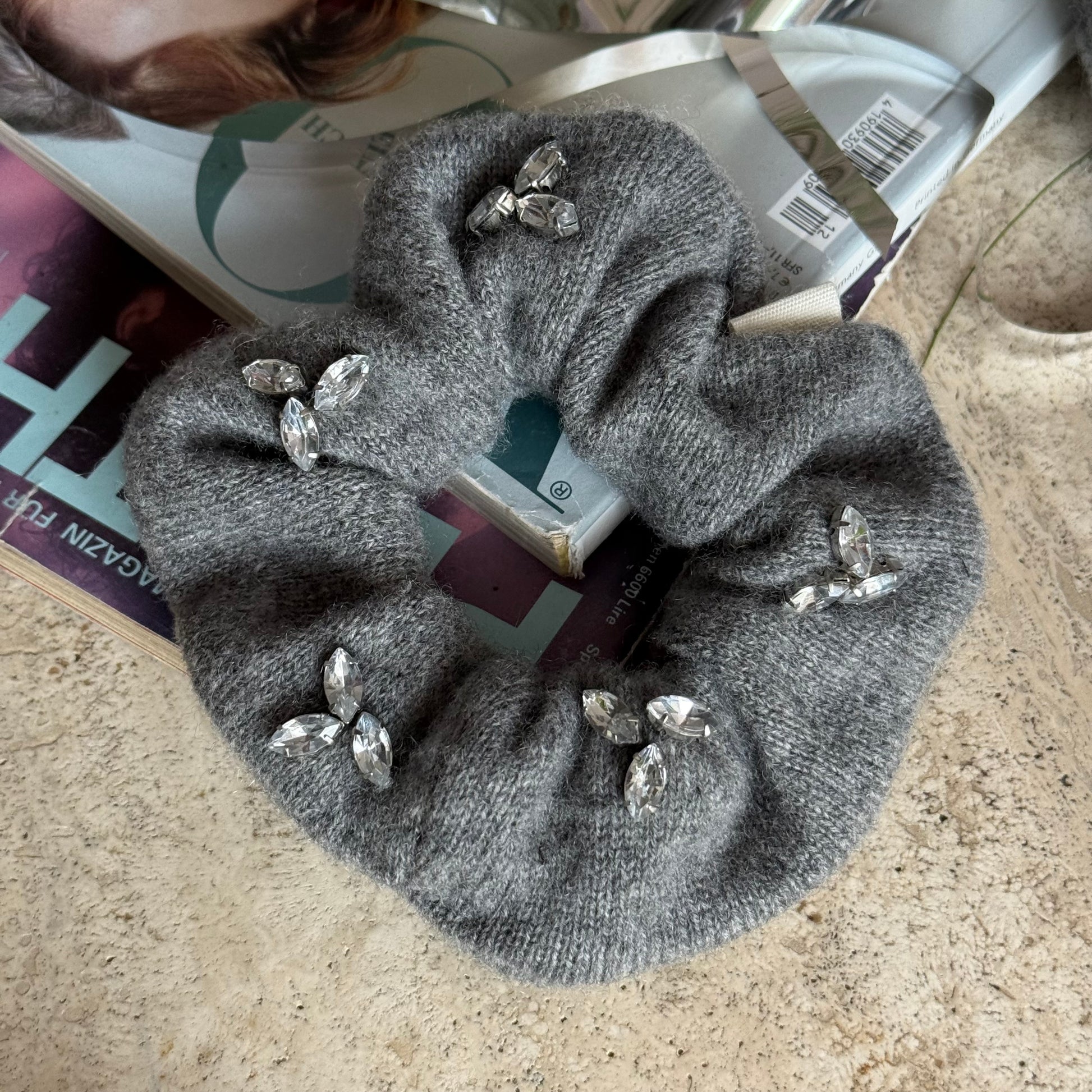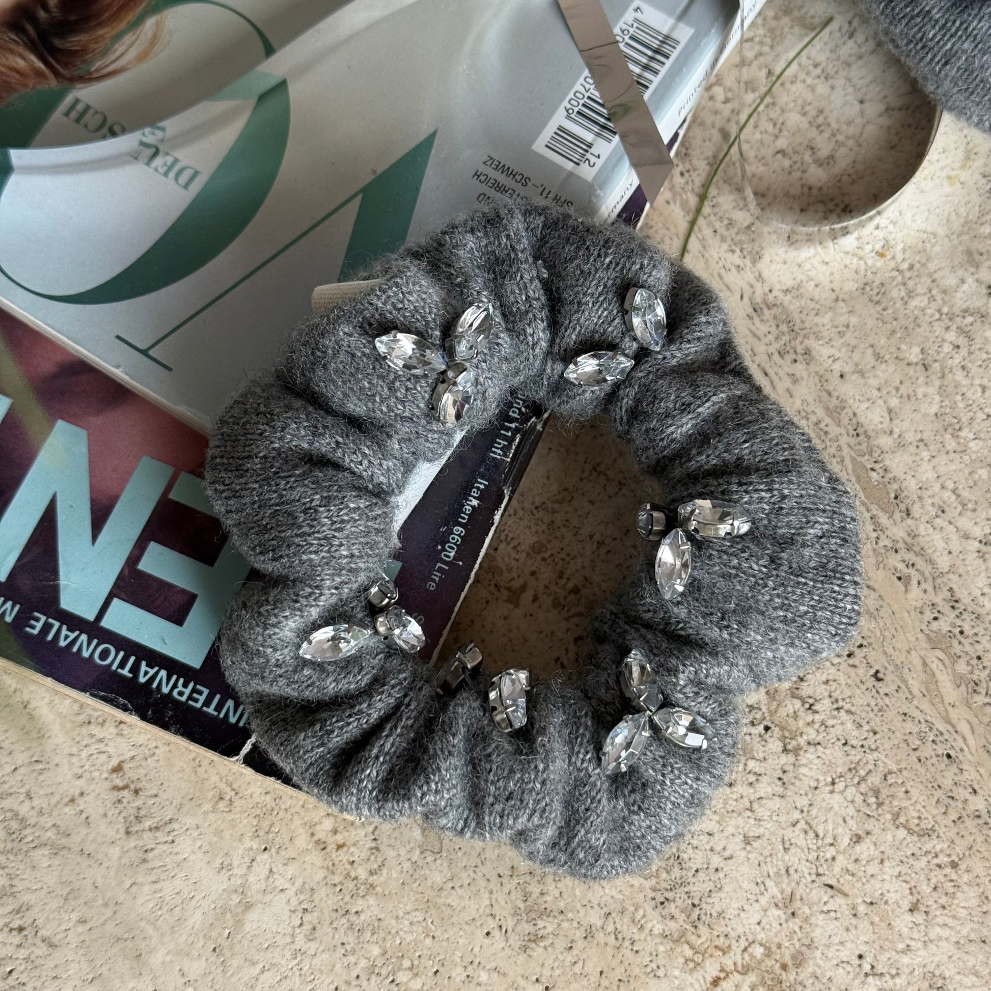 Dunkelgraues Kaschmir mit aufgesetzten Glitzersteinen. Diese Scrunchies stammen aus einem Kaschmir Pullover von der Marke Not Shy mit kleinen Löchern aber vor allem diesen hübschen funkelnden Glitzersteinen. Jeder Stein ist einzeln aufgenäht und gibt den Kaschmir Scrunchies diesen außergewöhnlichen Glam.