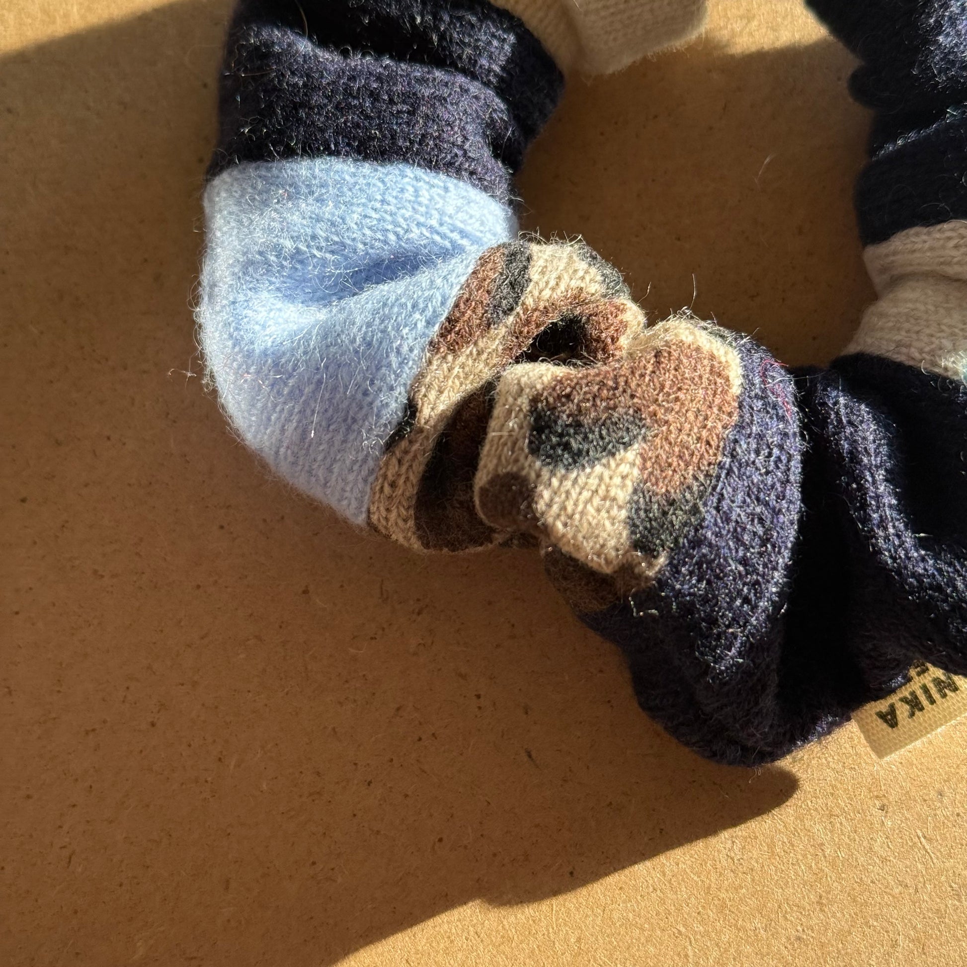 Patchwork Scrunchies bestehen aus den kleinsten Resten verschiedener Kaschmir-Kleidungsstücke. So entsteht eine einzigartige Haptik und Farbgebung.