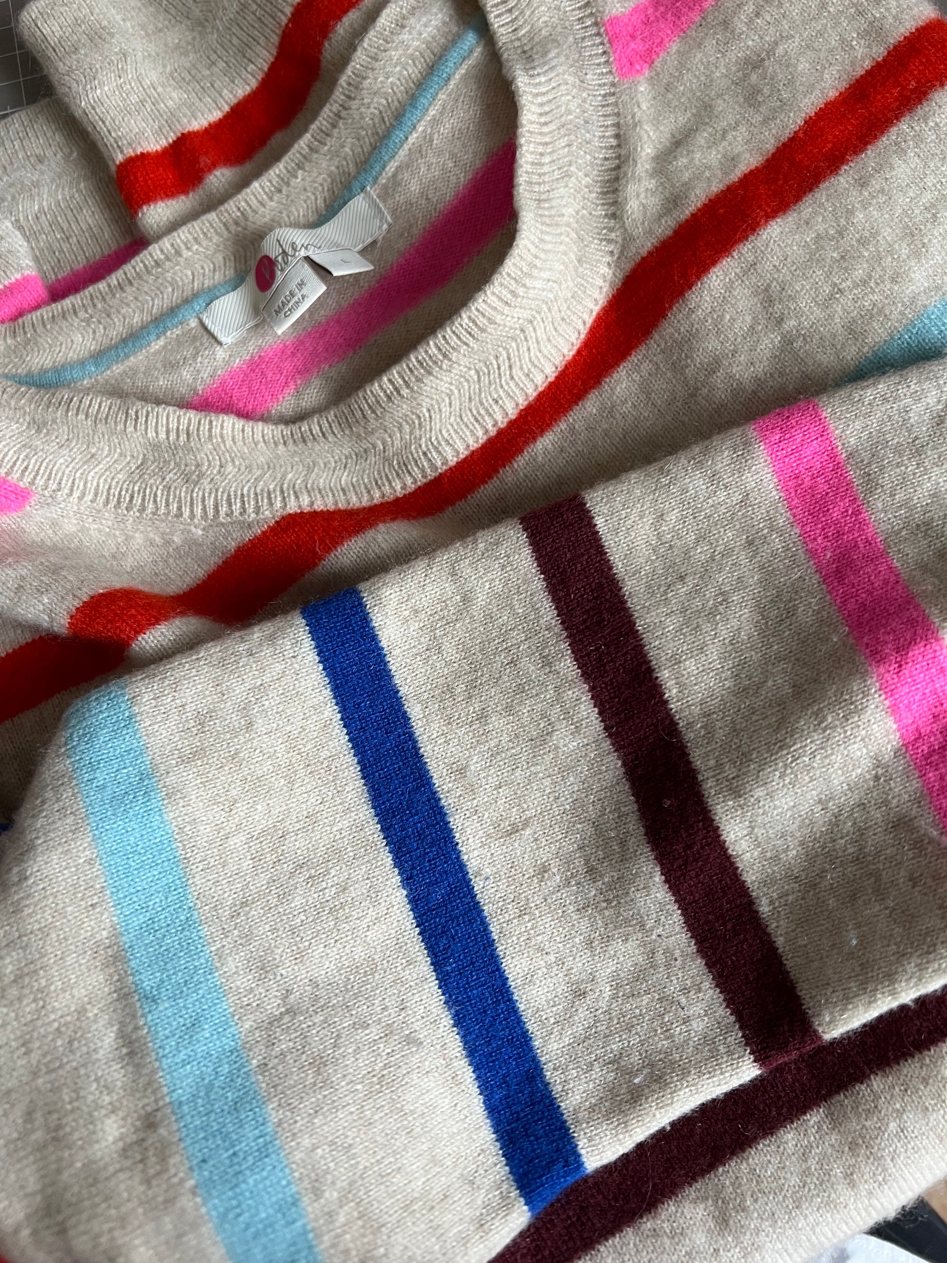 RAINBOW vereint zurückhaltendes Beige mit kunterbunten dezenten Streifen. Es stammt aus einem 100% Kaschmir-Pullover der Marke Boden mit leichten Gebrauchsspuren.